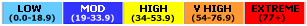 ![]() This index shows the amount of fuel available for combustion, indicating how the fire will develop after initial spread. It is calculated from the Duff Moisture Code and the Drought Code. The BUI scale starts at zero and is open-ended. A rating above 34 is high, above 77 is extreme. |
